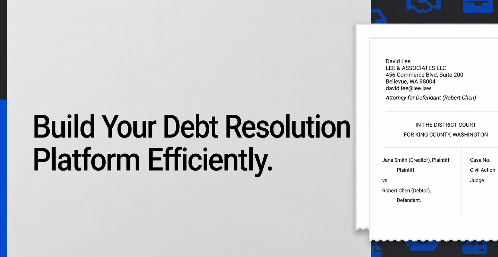 We help legal tech founders, law firms, and innovators build modern debt resolution platforms with guided workflows, document automation, payment integrations, case tracking, and user-friendly client experiences tailored to their business goals.